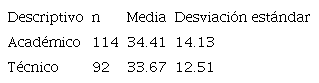 Con 95 por ciento de confianza, concluimos que no hay suficiente evidencia muestral para rechazar la hipótesis nula de igualdad entre las medias, con un p-valor de 0.68; sin embargo, sí hay suficiente evidencia muestral para rechazar la hipótesis de igualdad entre las desviaciones estándar de la población de colegios académicos y técnicos con un p-valor de 0.11.