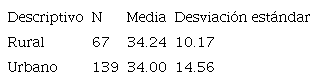 Con un nivel de confianza de 95 por ciento, no hay suficiente evidencia muestral para rechazar la hipótesis nula de igualdad de las medias para estas dos variables. Realizamos la prueba de hipótesis con hipótesis nula de igualdad de desviaciones estándar e hipótesis alternativa en la que la desviación estándar de urbano es mayor que rural; hay suficiente evidencia muestral para rechazar la hipótesis nula, con un p-valor de 0.0029.