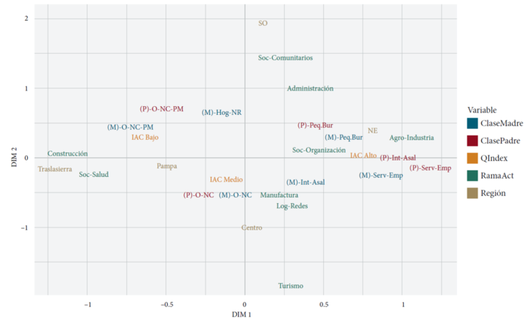 Para analizar simultáneamente la asociación entre las dimensiones individuales/familiares (la clase de origen ocupacional de los estudiantes, los activos culturales del hogar actual), institucionales (la carrera según rama de actividad) y sociales (la región socio-productiva) presentamos los resultados del ACM. El Gráfico 1 permite observar: