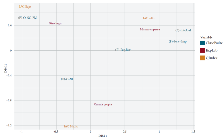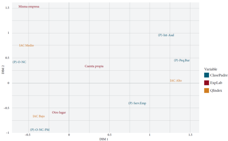 Para las variables de origen de clase ocupacional se realizaron imputaciones para el padre/madre ausente cuando sólo se tenía información para uno. Así, se obtuvo una población de estudio n=700. Los casos no computados (4) se deben a que la persona encuestada no especificó la carrera técnica que estaba estudiando. Para analizar los datos en esta primera etapa utilizamos la técnica de análisis multivariado de correspondencias múltiples (ACM). Se optó por esta técnica como una estrategia metodológica que permite visualizar los patrones de correlaciones entre las variables seleccionadas. El objetivo principal de esta técnica es analizar datos categóricos que son transformados en tablas y presentar los resultados de manera gráfica.