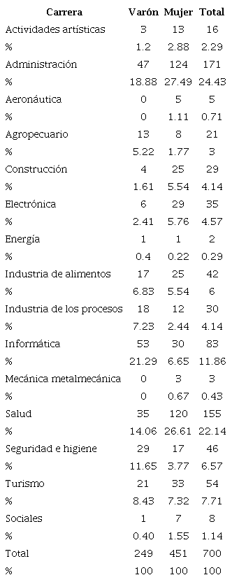 Por otro lado, exceptuando las carreras como seguridad e higiene, informática, industria de los procesos y agropecuaria, que poseen significativamente mayor proporción de población varonil, en el resto de las carreras técnicas predominan las estudiantes mujeres. Estos primeros resultados no sólo refuerzan la idea de que existen preferencias por determinadas orientaciones vocacionales según el sexo del estudiantado, sino que, con base en lo que sugieren los datos sobre productividad y demanda de trabajo provincial que hemos destacado más arriba, las carreras técnicas por las que optan los varones son aquéllas con mayor dinamismo económico y laboral. Así, es posible comenzar a ensayar una hipótesis de desigualdad de género relativa a la elección de los oficios o vocaciones profesionales para la fuerza de trabajo calificada en Córdoba.