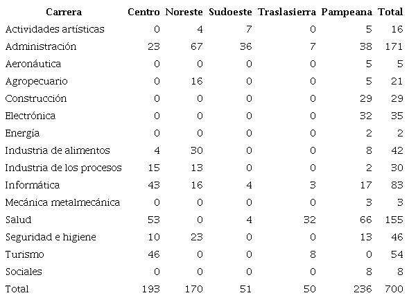 La Tabla 1 resume la distribución por sexo de estudiantes que estudiaban diversas carreras técnicas para la provincia de Córdoba. Como se aprecia, es posible sostener que son las carreras vinculadas a ramas de actividad del sector terciario de la economía (servicios), las que se sitúan en el primer lugar de preferencia de quienes egresarán como técnicos superiores: “administración” (24.2 por ciento) y “salud” (22.1 por ciento). Si bien las carreras agrupadas en estas dos ramas de actividad difieren significativamente en los campos de acción profesional (p. ej. contabilidad y enfermería), comparten la característica de ser carreras no manuales tradicionales, en las que la interacción social es una condición necesaria de la actividad profesional. Asimismo, se trata de carreras que en los imaginarios sociales se ubican como de “rápida inserción laboral”. En segundo lugar, las carreras vinculadas a ramas de actividad como Informática (11.8 por ciento) y Electrónica (4.5 por ciento) ocupan un lugar relevante en los procesos de formación profesional de la eventual fuerza de trabajo, lo que coincide con la preponderancia que tiene la industria del software en los últimos años en la provincia.