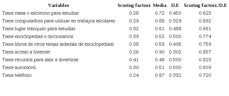 La Tabla 3 reporta los scoring factors del análisis de componentes principales (primer componente) para las 10 variables, con media 0 y desviación estándar 1.62. Como todas la variables toman el valor de 0 o 1, el peso tiene la siguiente interpretación: pasar de 0 a 1 cambia el índice de acuerdo con el valor del scoring factor/desviación estándar.