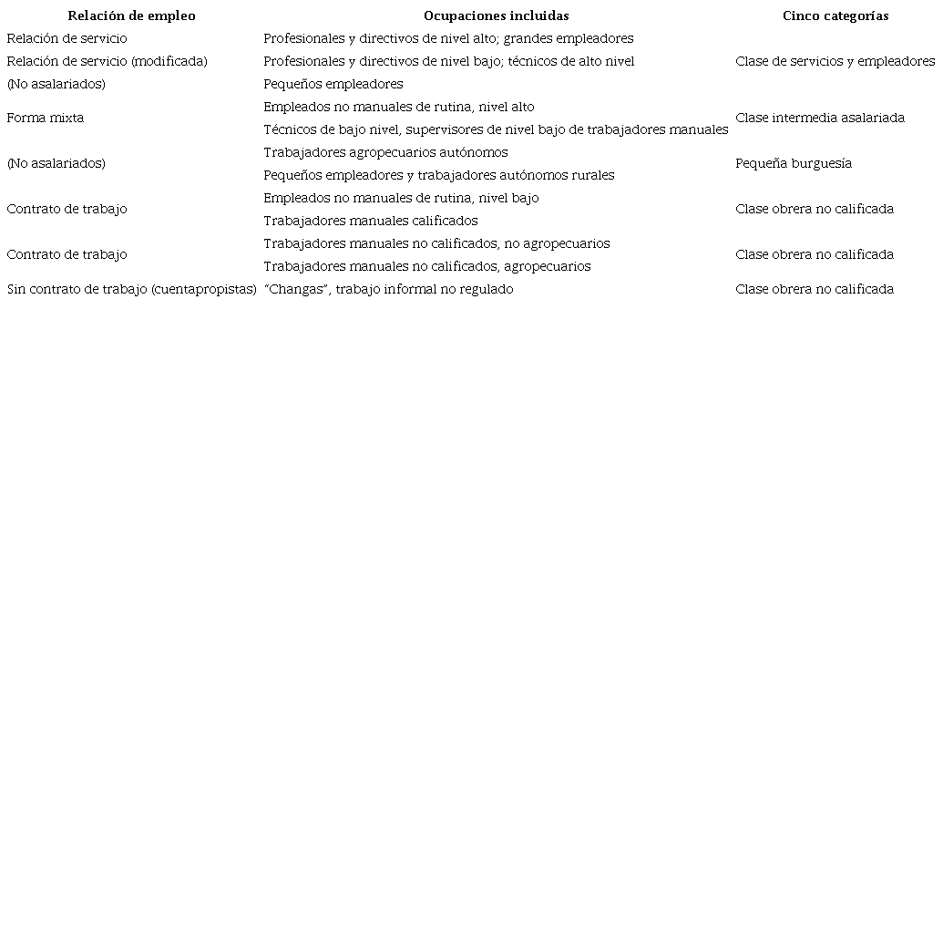 Para desarrollar la perspectiva relacional de clase propuesta para este estudio exploratorio, hicimos uso del esquema de clases desarrollado por Erikson y Goldthorpe (1992a; 1992b), el cual se basa en la distinción de tres grandes clases sociales (de servicio, intermedias y trabajadoras) que, a su vez, contienen diez categorías ocupacionales en función del tipo de actividad realizada.10 Dicho esquema ha sido usado como base para versiones instrumentadas en distintos contextos latinoamericanos. Para versiones en el caso argentino reciente véase Dalle (2016). Así, se construyeron por separado clases de origen ocupacional tanto del padre como de la madre del/la estudiante encuestado/a: