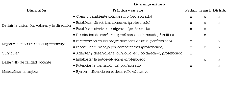 En referencia a la dirección escolar, en las últimas dos décadas se ha avanzado en integrar dichos enfoques del liderazgo. Expertos en el tema (Day et al., 2016; Leithwood, 2009; Elmore, 2010; etc.) han consolidado el enfoque teórico investigativo del liderazgo exitoso de la dirección escolar desde las perspectivas distribuida, pedagógica y transformacional. En el Tabla 1 se esquematiza un resumen de sus dimensiones, prácticas y el tipo de liderazgo que abarca: