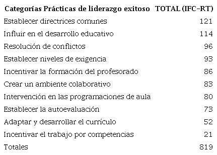 En la Tabla 2 las categorías se organizan por el recuento de sus referencias totales (IFC-RT). Se observa el grado de presencia de las UA categorizadas en las prácticas del liderazgo exitoso.