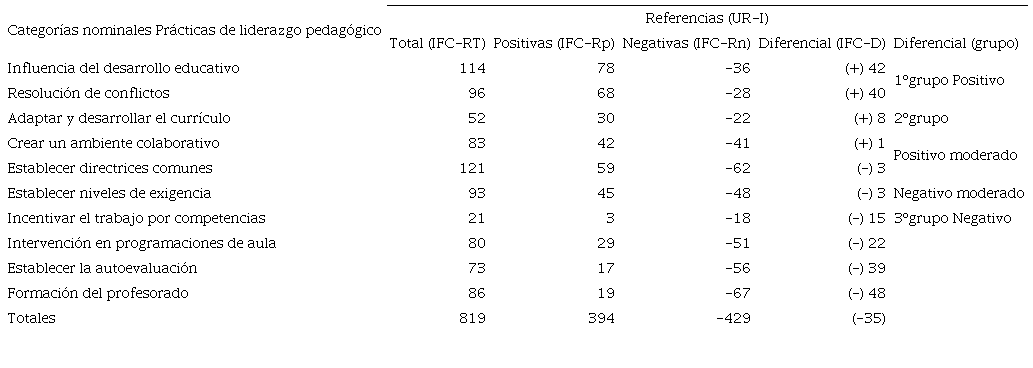 Las categorías se organizaron por diferenciales al aplicar el criterio de paridad numérica (Clairin y Brion, 2001). Destaca un primer grupo de prácticas: “influencia en el desarrollo educativo” y “resolución de conflictos” (convivencia), que fueron las más referenciadas positivamente y con un claro diferencial positivo. Un segundo grupo de presencia intermedia con cierto balance al distribuir sus UA, con una tendencia moderada positiva: “adaptar y desarrollar el currículo”, y “crear un ambiente colaborativo”. Lo mismo ocurre con “establecer directrices comunes”, “establecer niveles de exigencia”, y “establecer trabajo por competencias”, aunque con tenor negativo moderado. Finalmente, un tercer grupo evidentemente negativo en el que emergen: “intervención de programaciones de aula”, “establecer procesos de autoevaluación”, e “incentivar la formación del profesorado”. Todas ellas de corte pedagógico.