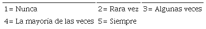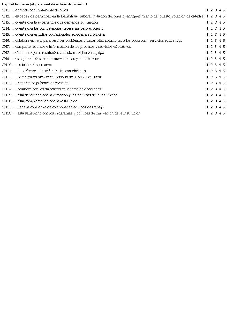 El cuestionario quedó conformado por dos secciones (ver Anexo). La primera sección está integrada por 18 ítems, que son presentados al encuestado en escala tipo Likert de cinco puntos (1=nunca; 2=rara vez; 3=algunas veces; 4=la mayoría de las veces; 5=siempre). Este apartado se enfoca a la recolección de datos de aspectos que caracterizan al capital humano, medidos desde la percepción que el personal docente y administrativo tiene de temas como el aprendizaje, la colaboración y el trabajo en equipo, entre otros (Bontis, 1998; Pedraza et al., 2017).