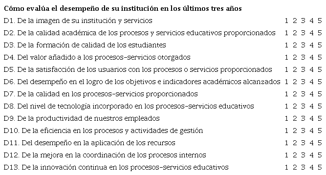 La segunda sección del instrumento fue dirigida a evaluar el desempeño de la institución educativa en los últimos tres años. Se desarrollaron 13 ítems, igualmente bajo escala tipo Likert de cinco puntos (1=pésimo; 2=malo; 3=regular; 4=bueno y 5=superior), para valorar aspectos como imagen institucional, innovación, calidad y desempeño. Adicionalmente se estableció una tercera sección para recabar datos generales del encuestado (puesto, antigüedad, edad, escolaridad, género), de plantel y zona geográfica.