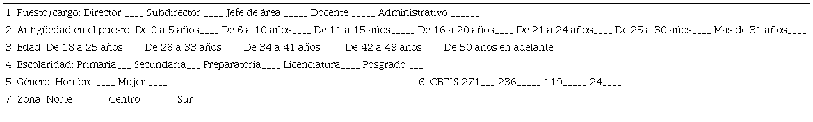 Objetivo. El presente cuestionario se aplica con el propósito de identificar en su institución, la gestión del capital humano y su relación con la competitividad educativa en el estado de Tamaulipas, específicamente en los Centros de Bachilleratos Tecnológicos, Industrial y de Servicios (CBTIS). La información proporcionada será para fines académicos, y se garantiza total confidencialidad de la misma.