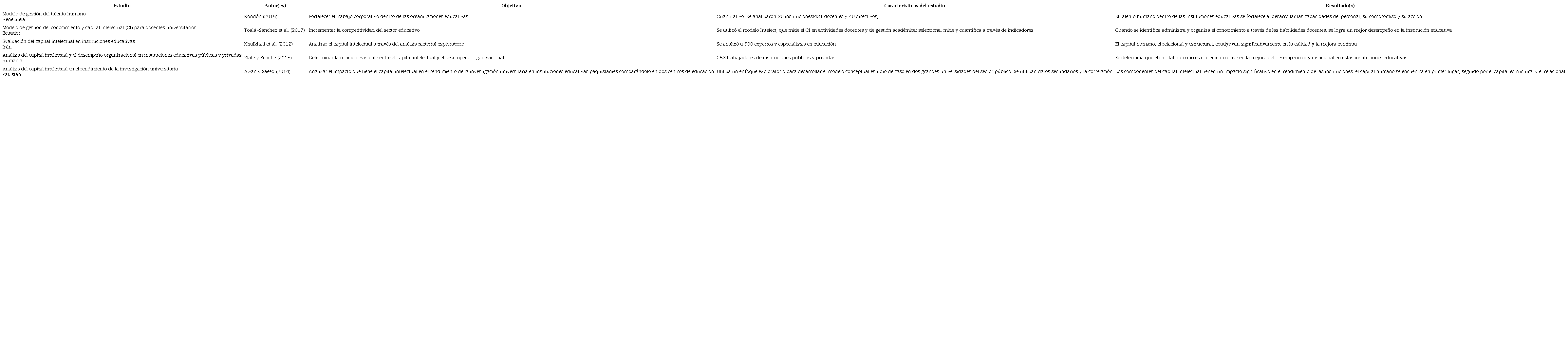 La Tabla 1 muestra algunos estudios empíricos que miden de alguna manera al capital humano en instituciones educativas: