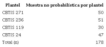 El análisis de los datos se realizó en cuatro planteles de educación media superior (EMS) que corresponden al nivel de gestión de la federación y que se encuentran localizados en Ciudad Victoria, Tamaulipas (México). Este tipo de planteles educativos se conocen como Centros de Bachillerato Tecnológico, Industrial y de Servicios (CBTIS), y tienen la misión de formar capital humano con competencias técnicas en diversas especialidades. Por tratarse de la fase piloto del instrumento, y al representar este estudio una fase preliminar de una investigación de mayor alcance, sólo participaron cuatro centros (271, 236, 119 y 24).