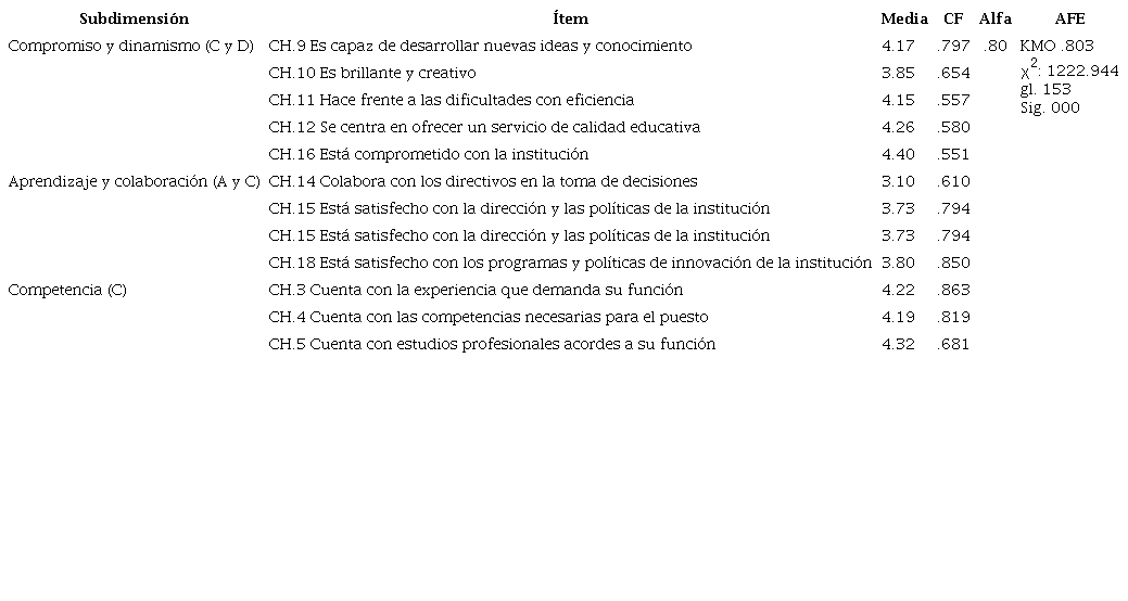 Al aplicar el AFE en la variable de capital humano se identificaron tres factores con autovalores superiores a 1, conformados por ítems con cargas factoriales adecuadas (.55 en adelante), puesto que se trata de un estudio piloto y, como tal, refleja resultados preliminares. Respecto de los aspectos que agruparon los factores del constructo de capital humano, éstos se denominaron: compromiso y dinamismo (C y D), aprendizaje y colaboración (A y C), y competencia (C) (Tabla 3). Los resultados arrojados mostraron un KMO aceptable (por arriba de .70), así como la prueba de esfericidad de Bartlett (p<.05), lo cual corrobora la conveniencia de la aplicación del AFE (Tabla 3). Así mismo, se confirmó un nivel de confiablidad adecuado para este constructo, con un alfa de Cronbach de .80 (Tabla 3).