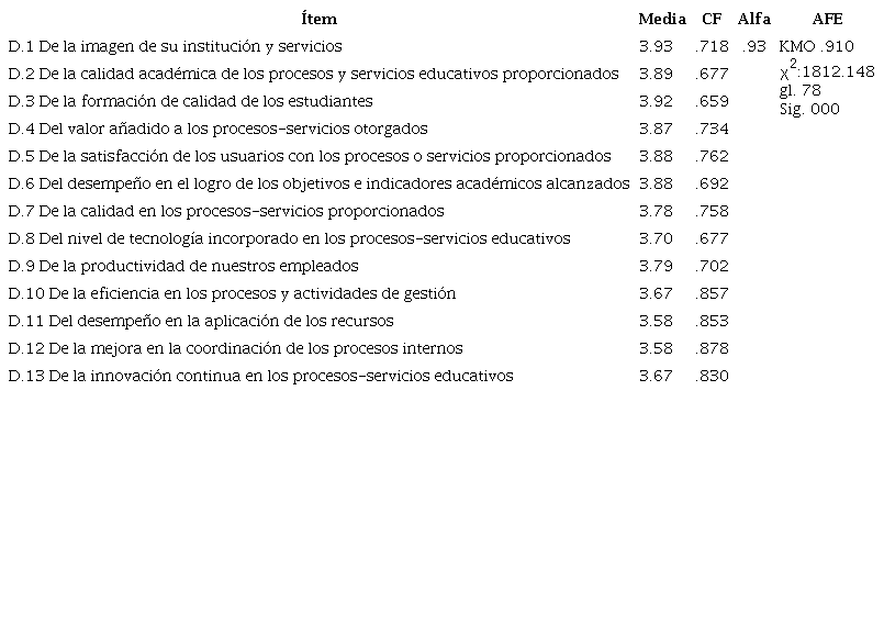 Se determinó también la conveniencia de aplicar el AFE (KMO por arriba de .70 y prueba de esfericidad de Bartlett p<.05) en la evaluación del constructo de desempeño (Tabla 4), y se determinó un comportamiento unidimensional, resultado que confirma lo señalado por Edvinsson y Sullivan (1996), Edvinsson y Malone (1999), y Norton y Kaplan (1993). En dicho constructo se observó que todos sus ítems mostraron carga factorial adecuada, ya que oscilaron entre .65 y .87, con un alfa de Cronbach de .80 favorable respecto a su consistencia interna (Nunally, 1994).