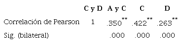 En primera instancia se procedió a analizar las correlaciones entre ambos constructos y se de terminó que existe una asociación positiva y significativa en cada una de las tres subdimensiones del capital humano (compromiso y dinamismo (C y D), aprendizaje y colaboración (A y C) y competencia (C) con la variable de pendiente de desempeño educativo (Tabla 5).