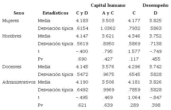 Con el interés de cumplir con los objetivos específicos de esta indagación, referente a si existen valoraciones distintas de los constructos estudiados respecto al género y tipo de puesto de los encuestados, se procedió a correr la prueba t. De esta forma se corroboró que no existen diferencias entre hombres y mujeres, ni entre administrativos y docentes, puesto que todos califican con el mismo nivel de importancia las dimensiones del capital humano y del desempeño en el presente estudio (Tabla 7).