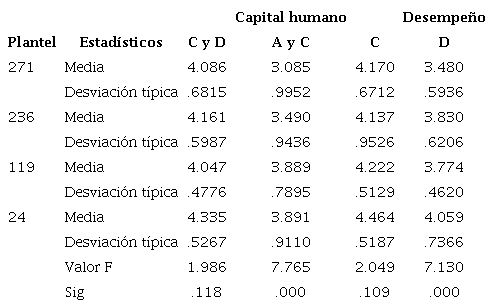 Se aplicó la técnica de ANOVA de un factor para valorar si existen apreciaciones diferentes en la valoración de los factores determinados en la dimensión de capital humano y el desempeño por plantel educativo (CBTis 271, 236, 119 y 24). Esta técnica permite comparar medias para tres o más grupos y determina si existen diferencias significativas (Ritchey, 2006).