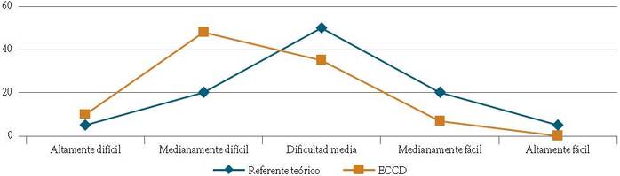 El promedio del índice de dificultad es de 0.50 ± 0.14 (media ± desviación estándar), por lo que resulta un nivel medio de dificultad y adecuado (Backhoff et al., 2000; Ding et al., 2006; Engelhardt, 2009). La distribución porcentual resultante del ID está constituido por: reactivos altamente fáciles (0 reactivos, 0 por ciento); medianamente fáciles (4 reactivos, 7 por ciento); dificultad media (21 reactivos, 35 por ciento); medianamente difíciles (29 reactivos, 48 por ciento); y altamente difíciles (6 reactivos, 10 por ciento). Claramente se observa en la Gráfica 1 un desfasamiento a la izquierda respecto de la distribución de la dificultad del referente teórico, lo cual indica que el ECCD es difícil de acreditar; sin embargo, 29 por ciento obtuvo una calificación igual o superior a 60, con la que acreditaron el ECCD.