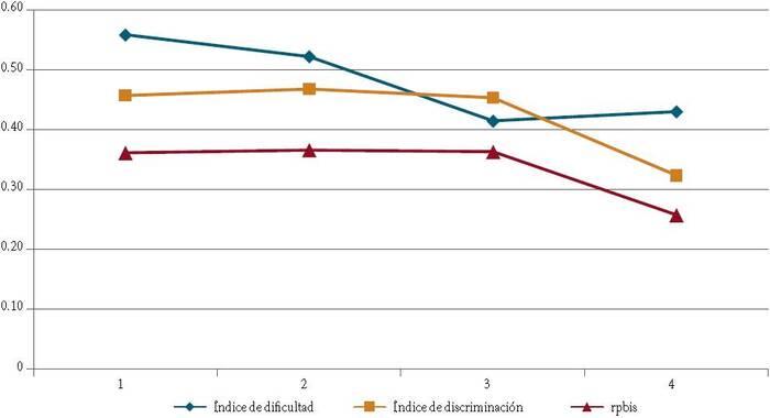 A continuación (Tabla 2) se describen las características del reactivo más difícil y el más fácil, de acuerdo al ID. Ambos quedan dentro del criterio de dificultad expuesto por Contreras y Backhoff (2004) y la teoría clásica de los test.