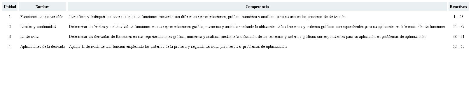 El ECCD explora cuatro unidades básicas de conocimiento del curso de cálculo diferencial, los reactivos que componen cada unidad y su competencia específica (Tabla 1).
