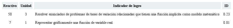Los resultados de la prueba muestran que las unidades 3 (la derivada) y 4 (aplicaciones de la derivada), que abarcan 38 por ciento del ECCD, son las de mayor dificultad para los estudiantes. Los reactivos de estas unidades se caracterizan por la necesidad de ejecutar varias secuencias de operaciones algebraicas para su resolución: el uso de más de un teorema o regla de derivación, abundante abstracción, la transformación del lenguaje natural al lenguaje algebraico, el uso de la intuición y la exploración e indagación. De manera particular, exhibimos los 10 reactivos con mayor dificultad cuyas demandas cognitivas son: plantear y resolver enunciados de problemas de tasas de variación, calcular la razón de cambio instantáneo en un punto a partir de su gráfica, probar las hipótesis de los teoremas de Rolle y valor medio, calcular máximos y mínimos, representar gráficamente la función derivada a partir de su gráfica, representar gráficamente una función trigonométrica inversa a partir de su expresión algebraica, calcular la derivada de una función logaritmo y de una función trigonométrica inversa. En estas unidades y en estos reactivos se demandan conceptos previos sobre funciones y límites, abunda el lenguaje simbólico y se tiene alto grado de abstracción; las actividades cognitivas predominantes son el tratamiento en un contexto algebraico y la conversión, mismas que cuentan con la mayor dificultad para los estudiantes, en contraste con la actividad cognitiva de representación.