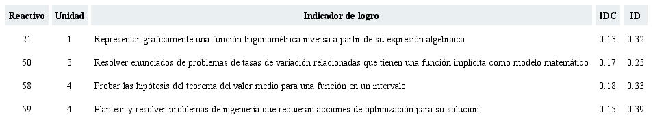 Se identificaron cuatro reactivos con un IDC menor a 0.20, mismos que se describen en la Tabla 3 y que, de acuerdo con los criterios psicométricos, son reactivos que se sugiere sean revisados en cuanto a una posible discriminación errónea, un error de edición, de redacción o, en su caso, debido a su complejidad cognitiva, ya que los cuatro reactivos son alta o medianamente difíciles.