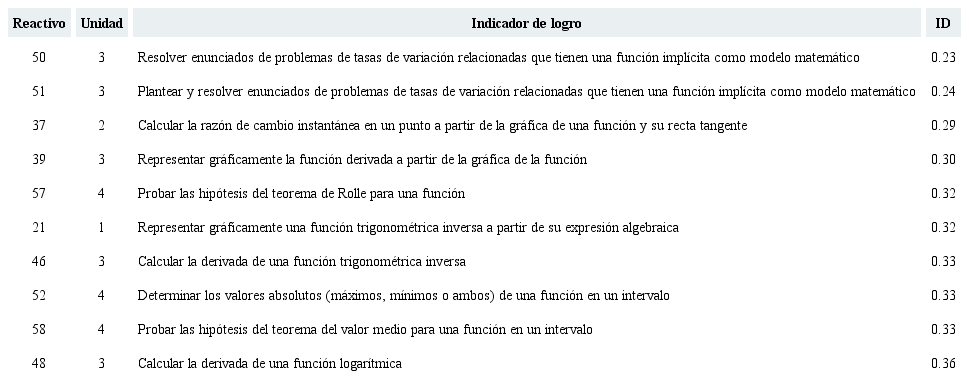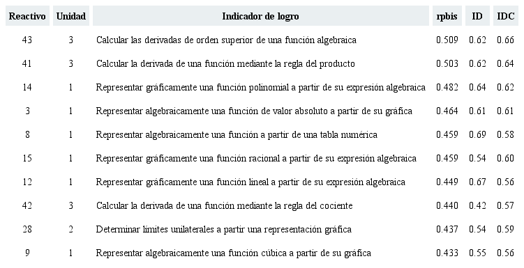 Una prueba post-hoc de Tukey entre las unidades de reactivos y el rpbis mostró diferencias significativas (p=0.016), específicamente entre la unidad 4: Aplicaciones de la derivada, y el resto de las unidades que conforman la prueba. En esta unidad hay un descenso importante -aunque no significativo- en los indicadores psicométricos: se tienen los índices más bajos de discriminación y rpbis; sólo un reactivo de esta unidad es de dificultad media y ninguno está calificado como medianamente fácil o altamente fácil. De manera más específica, en la Tabla 5 se exhiben los 10 reactivos con mayor rpbis; se incluyen también el ID e IDC con el objeto de evidenciar que dichos reactivos que son predictores del éxito de un estudiante en el ECCD a su vez son de dificultad media y discriminan de manera excelente de acuerdo a Backhoff et al. (2000).