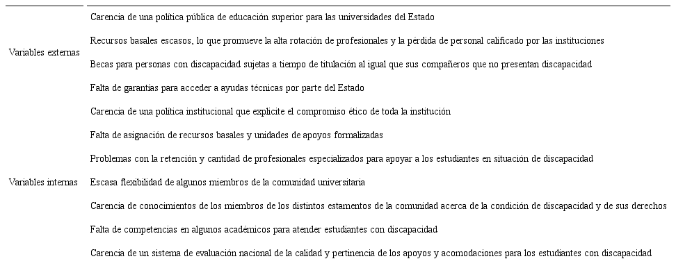 Por otra parte, el informe de la Red de Universidades Estatales Chilenas por la Inclusión de Estudiantes en Situación de Discapacidad (2019) hace referencia a las barreras que enfrentan las universidades del CUECH para implementar iniciativas de inclusión. Según los resultados, existen variables internas y externas que dificultan la labor de las unidades o programas de inclusión (Cuadro 1). Las respuestas de la encuesta reflejan la realidad particular de estas instituciones, y coinciden con los resultados de las diversas investigaciones antes presentadas.