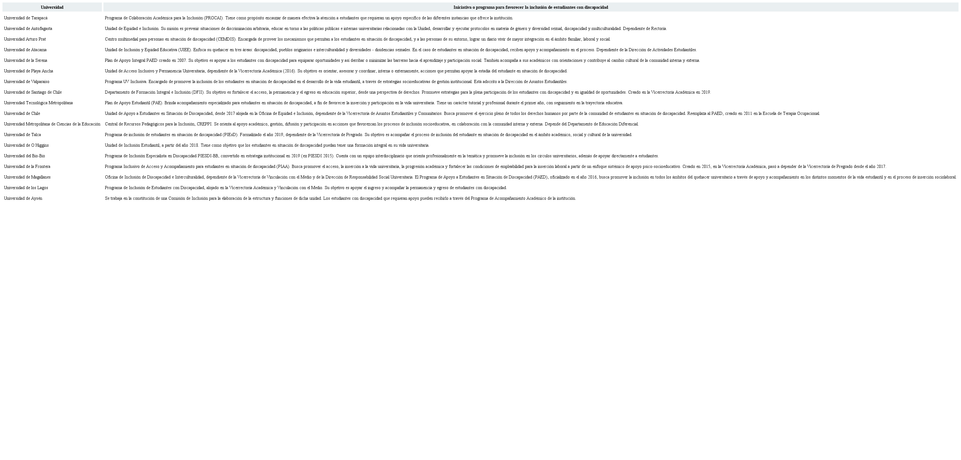 Destacan también otras iniciativas gubernamentales, como la aprobación, por parte de la Cámara de Diputados de Chile (2019), para crear un programa inclusivo para la educación superior a nivel nacional, similar a los apoyos que se brindan durante la educación escolar, con la finalidad de acompañar las transiciones hasta la universidad y posibilitar el acceso y progreso en los estudios superiores.