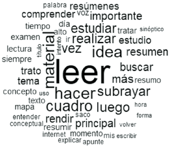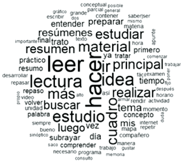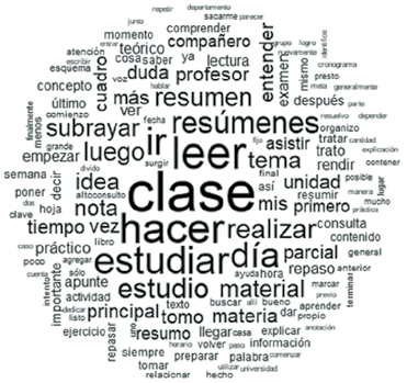 El análisis del subcorpus de datos correspondiente a 81 estudiantes que cursaban el primer año de sus carreras en modalidad presencial y que mostraron un alto rendimiento académico al finalizar el primer cuatrimestre, arrojó la nube de palabras que se presenta en la Fig. 1.