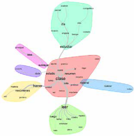 El nodo central, encabezado por la forma clase, conecta con otros cuyas formas más destacadas son leer, hacer resúmenes, estudiar, y esta forma coocurre con día, tiempo, después, lo que da idea de que la dimensión temporal es importante para estos estudiantes.