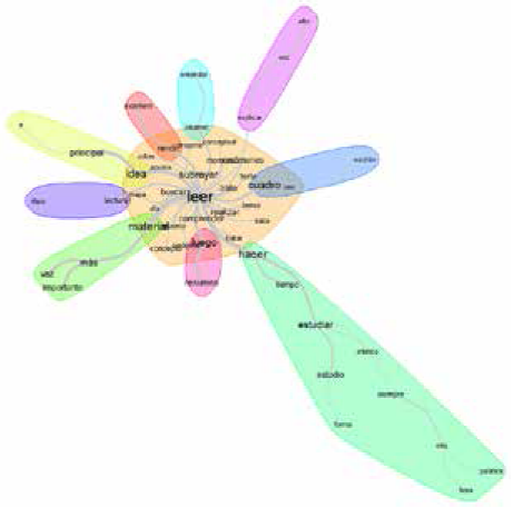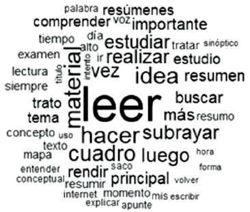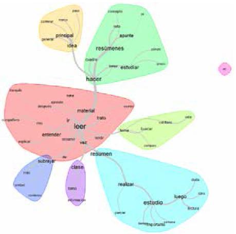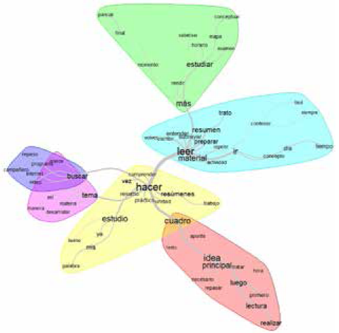Las formas más destacadas, con mayor frecuencia mencionadas, fueron leer y lectura (49 menciones entre ambas), resumen, resúmenes y resumo (42 menciones entre las tres formas), estudiar y estudio (35 menciones entre ambas), hacer (28 menciones), idea (21 menciones). El análisis de similitudes arrojó los resultados que se muestran en la Fig. 6.