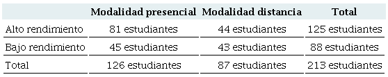 Se trabajó con 213 estudiantes del primer año de carreras de ciencias económicas de una universidad pública argentina. Los participantes fueron asignados a cuatro grupos con base en la consideración de dos variables: 1) modalidad de cursado: presencial o a distancia; y 2) rendimiento académico: alto y bajo. Así, el grupo 1 se conforma de 81 estudiantes en modalidad presencial y que lograron acreditar todas las asignaturas correspondientes al primer cuatrimestre (alto rendimiento); el grupo 2 está integrado por 45 estudiantes que cursaban sus estudios en modalidad presencial y que no lograron aprobar todas las asignaturas (parte de ellos acreditaron alguna/s, mientras que otros no lo lograron en ninguna); el grupo 3 se conforma de 44 sujetos en modalidad a distancia y que lograron acreditar todas las asignaturas del primer cuatrimestre (alto rendimiento); el grupo 4 está conformado por 43 estudiantes en modalidad a distancia que no lograron acreditar todas las asignaturas en el primer cuatrimestre (parte de ellos regularizaron alguna/s, mientras que otros no lograron regularizar ninguna). La Tabla 1 resume la composición de los grupos.