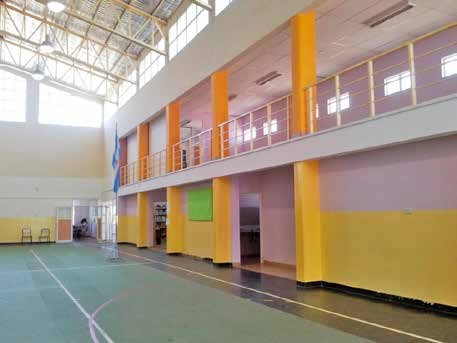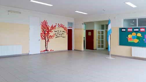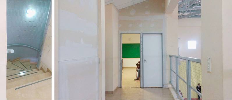 Aún puede verse en la imagen el material en seco de la construcción, sin terminar. Al aula le quedó doble puerta, aunque sólo se utiliza una. La reja que bordea el pasillo que conduce al aula permite mirar hacia el gimnasio. A los problemas de acústica de este espacio, ya sea por el sonido que produce la caldera y/o las actividades físicas, se le suma el encierro por la falta de ventanas que conecten con el exterior. Las ventanas son cerradas y una abre hacia el gimnasio.