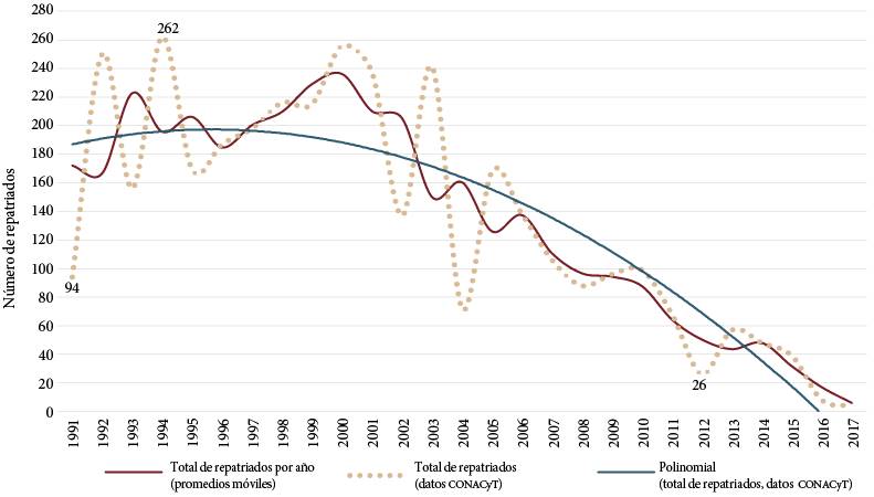 Al obtener una línea de tendencia y graficar los promedios móviles cada tres años, notamos que el periodo en que se dio la mayor cantidad de repatriaciones fue la última década del siglo XX. Después del año 2000 se aprecia un descenso sostenido, que posiblemente se deba al decremento de la inversión del Estado mexicano en este rubro debido a que había poco interés en atraer a México a quienes se habían formado en el extranjero y se habían insertado en el mercado laboral de países con mayor desarrollo.