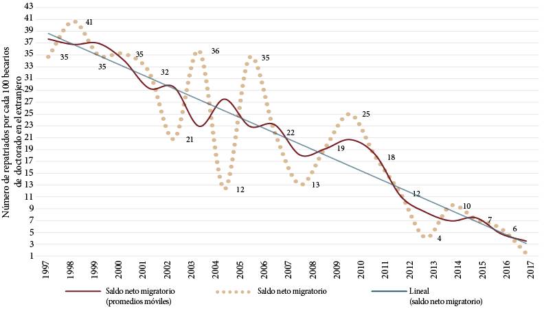 Una de las caídas más pronunciadas en el programa de repatriación se dio en 2004, cuando sólo se financiaron 72 apoyos; el año anterior se había beneficiado a 241 investigadores. Otro año importante en términos de descenso fue 2012, cuando se otorgaron apoyos sólo para 26 repatriaciones; en 2011, con un ligero repunte, se registraron 68. Entre 2011 y 2017 el descenso de las repatriaciones es sostenido.