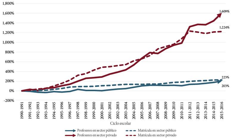 En el ciclo escolar 1990-1991, el sector privado contó con 1 mil 528 profesores de posgrado para 8 mil 909 alumnos, y en el ciclo escolar 2015-2016 llegó a 26 mil 119 profesores para 117 mil 989 alumnos. Considerando el mismo periodo, el sector público inició con 10 mil 483 profesores para 36 mil 690 alumnos, y llegó a 31 mil 740 para 119 mil 628.