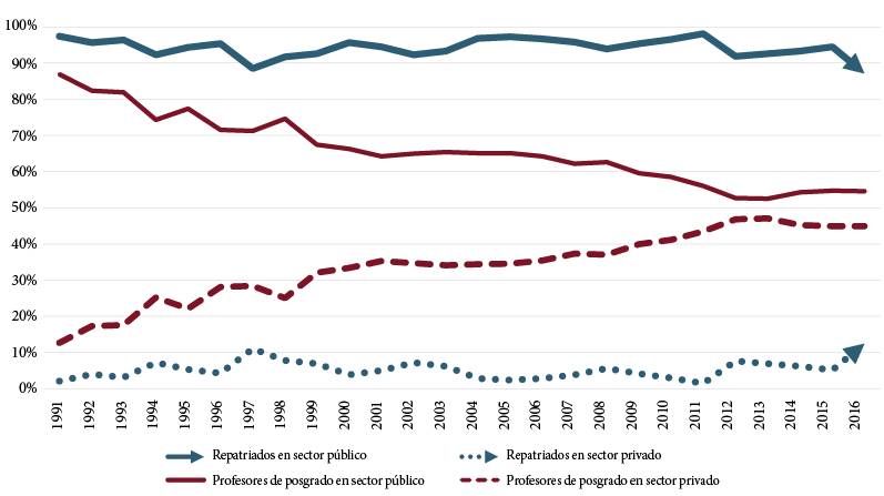 En este contexto, se requería la presencia de investigadores mexicanos formados en universidades extranjeras de prestigio, en todos los campos del conocimiento. Sin embargo, el retorno de éstos no fue suficientemente apoyado en todas las entidades del país. La repatriación se concentró en las universidades y centros de investigación mejor posicionados en los rankings, ubicados en el centro y, en algunos casos, en el norte del país. En comparación con el número de becas para estudiar doctorado en el extranjero otorgadas por el CONACyT, la repatriación de investigadores fue muy escasa, especialmente en el periodo 20122017. Asimismo, en este periodo podemos notar un fuerte crecimiento del sector privado en relación con el aumento de matrícula y contratación de profesores a nivel posgrado, y un estancamiento sostenido en el sector público.