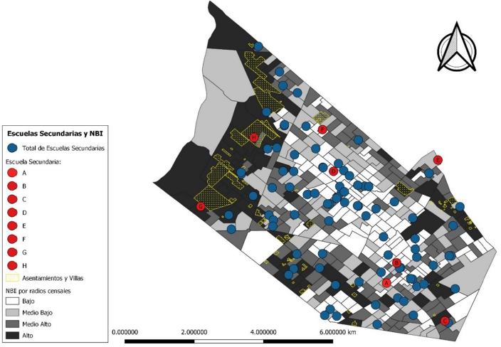 En el segundo grupo (escuelas C, D, E y F), donde se agrupan las escuelas que expresan los intermedios de sus emplazamientos en zonas de NBI medios bajos (C y D) y medio altos (E y F) no hay una correspondencia entre ubicación y nivel de precaridad. Así, en el caso de las escuelas C y D, ambas emplazadas en una zona de NBI medio bajo, la primera se encuentra lejos de asentamientos precarios y barrios populares, y la segunda está emplazada cerca. Además, si se observa el Mapa 1, la escuela C se ubica en una zona en cuyos alrededores hay radios censales con NBI medio alto o alto; en cambio, en los alrededores de la escuela D hay radios censales con NBI medio bajo o bajo. Las escuelas E y F, ambas emplazadas en una zona de NBI medio alto, se encuentran muy cerca de asentamientos precarios y barrios populares a la vez que sus radios censales aledaños varían en uno y otro caso. Aquí la correspondencia tampoco va de la mano con los índices escolares.