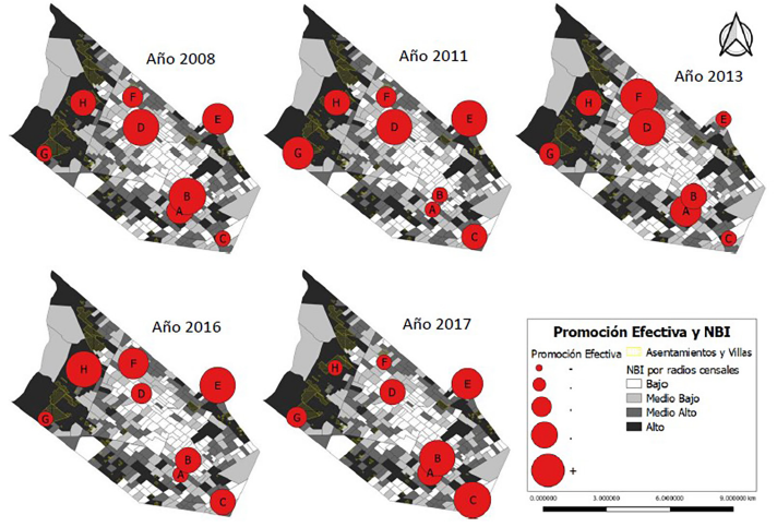 Además, tomando en cuenta que estudiar las tramas que configuran las desigualdades socioeducativas implica indagar no únicamente en el contexto del espacio urbano sino también acercarnos al espacio escolar para analizar aquello que sucede allí al interior de las escuelas (Bourdieu, 1979; Bernstein, 1998; Willis, 1988), es crucial resaltar que la cartografía nos ha facilitado interactuar tanto con las características del espacio urbano (NBI) como con aquello que sucede dentro de las instituciones (tasas de escolaridad). Sin duda, explorar otras dimensiones de análisis al interior de las escuelas, como los cambios de autoridad, las adaptaciones a las transformaciones curriculares y a las reformas educativas u otras que sean explicativas de aquello que sucede en la producción de estas tasas constituye un desafío para profundizar los resultados aquí presentados sobre la desigualdad educativa.