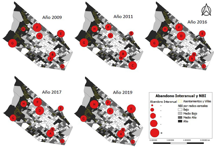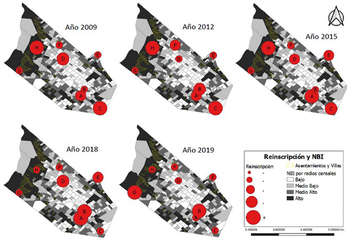En estas comparativas vale resaltar la particularidad de que, en un periodo de cinco años consecutivos, de 2013 a 2017, se desplegó un constante aumento en el reingreso de estudiantes al sistema educativo en la escuela H emplazada en zonas con mayores necesidades. Allí se destacan los esfuerzos institucionales de las conducciones y de las y los docentes para que sus estudiantes sigan estando escolarizados. El reingreso al sistema educativo se produce indistintamente en instituciones emplazadas en distintos lugares, aunque destaca de forma predominante en aquellas instituciones con mayores necesidades básicas insatisfechas. Ello se vislumbra de la misma manera, aunque con porcentajes absolutos inferiores, también en el grupo comparativo de escuelas emplazadas en NBI intermedios, donde las escuelas D (medio alto NBI) y C (medio bajo NBI) tienen variaciones en casi todos los años que se muestran en el Mapa 4.