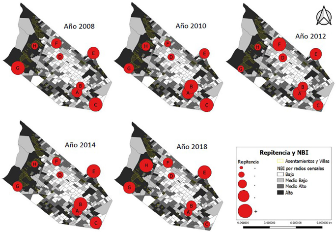 Como puede verse en el Mapa 5, en el rango de tiempo analizado las escuelas emplazadas en zonas con medio alto y medio bajo NBI expresan de forma predominante la mayor repitencia. Sin embargo, al igual que en los otros índices de escolaridad, en éste también se identifican particularidades en las variaciones de aumento y disminución que pueden ser abordadas de manera particular.