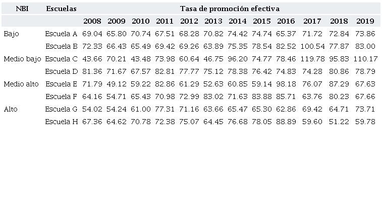Al hacer la comparativa polarizada entre escuelas con alto y bajo NBI (A, B, G y H) se obtuvo heterogeneidad en los movimientos ascendentes y descendentes, así como en las continuidades del comportamiento del índice en escuelas emplazadas en zonas con bajas necesidades básicas insatisfechas y escuelas que expresan su contrario en función de la profundización de la precaridad. De esta forma, si se hace una primera comparativa entre las escuelas A y H, las pronunciadas variaciones de forma creciente y decreciente se producen en la escuela con alto NBI, mientras que en la escuela con menores necesidades las variaciones son menos pronunciadas. Una segunda comparativa, entre las escuelas B y H, expresa un comportamiento similar desde el año 2008 hasta el 2016 en los movimientos de la tasa de promoción efectiva, siendo ésta en este último año mayor para la escuela con alto NBI. A partir del año 2017 se produjo una polarización en este índice, de manera que el mayor grado de promoción escolar correspondió a la institución con bajo NBI, además de que hasta el 2019 se observó un descenso abrupto de dicha tasa en la escuela H. Una tercera comparativa, entre las escuelas A y G, expresa nuevamente un comportamiento similar en la tasa, aunque la escuela con alto NBI tiene el pico más pronunciado hacia el 2011 y luego desciende por debajo de la escuela A hasta regresar, en 2019, al valor de 2008. A diferencia de lo que sucede con una cuarta comparativa, el pico más pronunciado es para la escuela con bajo NBI en el año 2017 y, aunque el comportamiento es semejante en ambas escuelas, siempre la promoción efectiva es mayor en la escuela con bajo NBI.