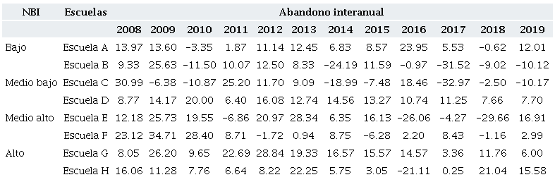 En el grupo comparativo polarizado, el modo en que la tasa de abandono escolar se despliega en dos de las escuelas seleccionadas con alto (escuela G) y bajo NBI (escuela B) se observan movimientos que indican que los procesos en ambas instituciones son semejantes en función de las disminuciones y aumentos entre los años 2008 y 2019. Es decir, se observa un cierto paralelismo en las tendencias, más allá de las cifras porcentuales absolutas, respecto de los procesos que viven ambas instituciones de distintos emplazamientos urbanos. En las dos instituciones, en el 2009 se produce un pico ascendente, en el 2010 otro descendente, y luego hasta 2014 hay una cierta meseta intermedia en la cual se origina una nueva caída fuerte. En el 2015 hay una lenta recuperación para luego producirse la bajada más pronunciada de la tasa hacia el 2017 con una muy leve recuperación hacia el 2019. El paralelismo de "ambas líneas" de abandono es casi perfecto, aunque la línea de la escuela G es más pronunciada que la de la escuela B.
