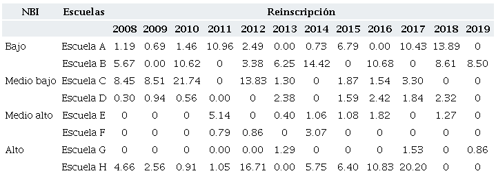 En el primer grupo comparativo, las escuelas con criterio polarizado (A, B, G y H) en función de los niveles de profundización de las situaciones de precaridad, se observa que los procesos de reinscripción de desarrollan con fuertes variaciones entre un año y otro. Al comparar, las escuelas A (bajo NBI) y H (alto NBI) se observa que, en 2012, 2014, 2016 y 2017 las tasas de reinscripción siempre fueron más altas en la escuela con mayor situación de precaridad. El proceso inverso, es decir, la mayor tasa de reinscripción de la escuela A en esta comparativa sólo se produce en dos años (2011 y 2018). Creemos que en esto cumple un papel clave la modalidad técnica de la escuela. Así, al comparar las escuelas B (bajo NBI) y H (alto NBI) se observa que también en 2012, 2015, 2016 y 2017 las tasas de reinscripción fueron más altas en la escuela con mayor precaridad. El proceso inverso, las tasas de reinscripción mayor para la escuela con menor precaridad, se produjeron en los años 2010, 2013, 2014, 2018 y 2019.