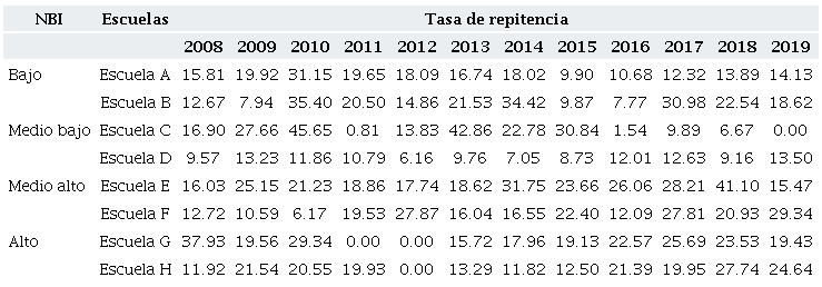 En la comparativa focalizada en escuelas polarizadas en alto y bajo NBI (A, B, G y H) destaca que la mayor tasa de repitencia no siempre corresponde a las escuelas con mayores necesidades. Al comparar las escuelas A y H, tal correspondencia se produce sólo hacia los últimos cuatro años (2016, 2017, 2018 y 2019); en los años anteriores la repitencia es similar (2009 y 2011) o menor (2008, 2013 y 2014) a la escuela emplazada en bajo NBI. De hecho, en el año 2010 la escuela con mayor NBI alcanza de forma predominante la menor tasa de repitencia escolar en relación con la otra institución. Estas variaciones caracterizan la desigualdad socioeducativa no de forma homogénea ni polarizada, sino que se despliega en modo de estallido por los diferentes fragmentos respecto de los niveles de precaridad.