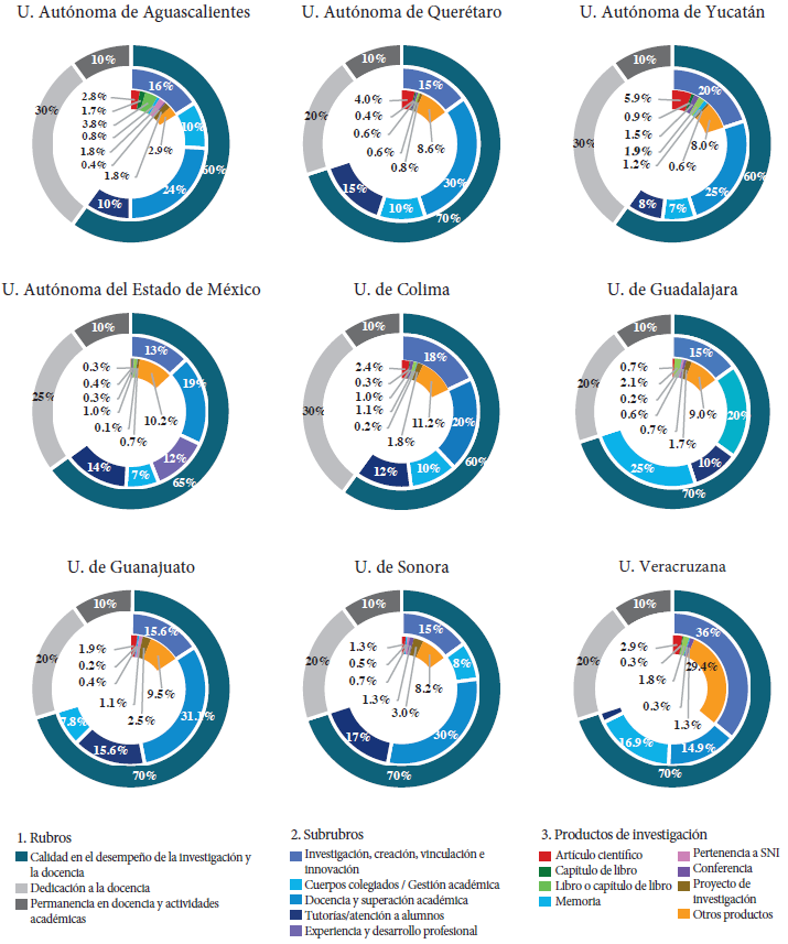 Resalta que el subrubro de docencia es el mejor valorado en siete de los nueve programas analizados, en los que adquiere un peso relativo de entre 19 y 31.1 por ciento en el total del puntaje; una excepción al respecto son la Universidad de Guadalajara, donde el aspecto mejor valorado es la gestión académica, y la Universidad Veracruzana, la cual valora primordialmente actividades de publicación científica.y Por su parte, en la mayoría de los programas el subrubro de investigación adquiere un valor de entre 13 y 20 por ciento, con excepción de la Universidad Veracruzana, que le asigna 36 por ciento. La importancia de la generación de materiales de docencia en la mayoría de los programas es un aspecto que da cuenta de la orientación de este instrumento de evaluación, primordialmente enfocado a fortalecer la enseñanza. Otra perspectiva desde la cual se puede dimensionar la alta valoración del subrubro docencia respecto del subrubro investigación es: si un académico generase todos los productos posibles en las cantidades máximas establecidas, obtendría un mayor beneficio de la generación de materiales de apoyo al estudiante que de la publicación de productos derivados de investigación. En el primer caso podría cubrir hasta 31.1 por ciento del puntaje total de los programas, y en el segundo apenas 20 por ciento.