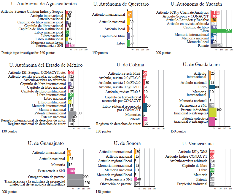 En una proyección (hipotética) en que un académico realizara todos los productos de investigación posibles y en la mayor cantidad admitida en cada UPE, éstos se valorarían de diferente forma por cada una de las universidades, lo que permite hablar del efecto performativo de cada uno de los esquemas de evaluación. Por ejemplo, en contraste con las universidades de Aguascalientes, Estado de México y Guadalajara, en las que el libro es el producto mejor valorado (con 3.8, 1 y 2.1 por ciento respectivamente del valor total del programa), existen casos como las universidades de Guanajuato y Sonora donde éste no es considerado en sus esquemas de evaluación académica. Asimismo, el capítulo de libro no es reconocido por las universidades de Guadalajara, Guanajuato y Sonora. Lo anterior conduce a cuestionar en qué medida esto constituye un mecanismo que inhibe tanto la publicación de libros como la participación en libros colectivos a partir de la publicación de capítulos, formatos centrales de comunicación y debate en áreas como las ciencias sociales y las humanidades.