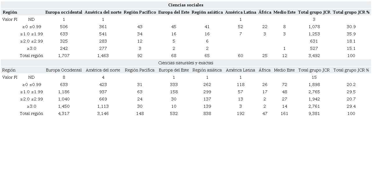 De igual forma, el instrumento de evaluación de la Universidad de Colima tiene la particularidad de establecer parámetros diferenciados de FI por áreas de conocimiento (en el análisis fueron considerados los propios del área de ciencias sociales). El rango de FI de esta área supera el de ciencias naturales y exactas, que tradicionalmente tienen valores superiores. Esto resulta contradictorio a lo que se observa en el propio referente de evaluación que considera la Universidad de Colima: en el JCR en su edición 2020 se identifica que en las revistas de ciencias sociales los grupos más poblados son los que tienen un FI de entre 0 y menor a 2.0 (66.8 por ciento de las revistas se ubica aquí). Por su parte, en las revistas de ciencias naturales y exactas se observa una mejor valoración en términos de FI, dado que los grupos según este parámetro muestran una distribución más equilibrada, como se observa en la Tabla 1.