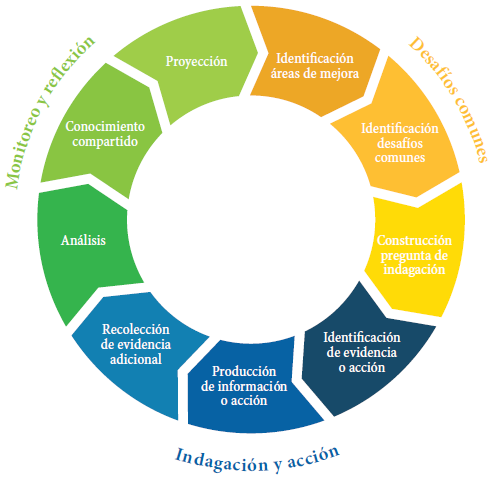 En este contexto resalta el valor de la indagación colaborativa como una metodología de trabajo y aprendizaje en red (Ainscow et al., 2016; Chapman et al., 2016). La indagación colaborativa es una modalidad de investigación acción participativa focalizada en las prácticas profesionales de docentes y directivos, cuyo propósito es comprender y mejorar los procesos de enseñanza y aprendizaje (Carpenter, 2017; Emihovich y Battaglia, 2000; Pino-Yancovic y Ahumada, 2020). La indagación colaborativa es un proceso cíclico en el cual se identifican desafíos comunes de las escuelas y actores miembros de la red, se planifican y realizan acciones en conjunto y se reflexiona sobre los resultados de estas acciones (DeLuca et al., 2015; Pino-Yancovic et al., 2020).